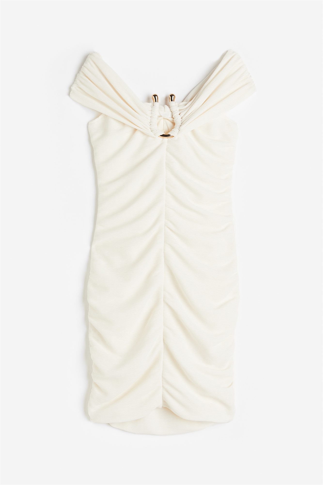 Короткое, приталенное платье без плеч из фактурного джерси со сборчатыми швами, создающими эффект рюша. Короткие рукава и U-образная металлическая деталь, создающая сборки спереди.