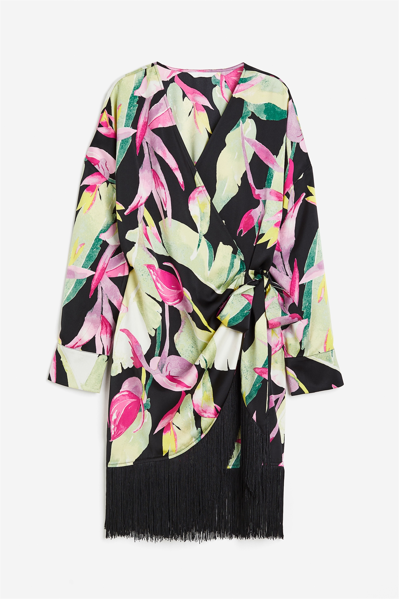 Короткое платье из мягко драпирующегося атласа с V-образным вырезом и облегающим передом с широкими завязками с одной стороны. Низко опущенные плечи и длинные рукава с разрезом и пуговицей на манжетах. Эластичный шов на талии сзади. Длинная бахрома по подолу. Без подкладки.
