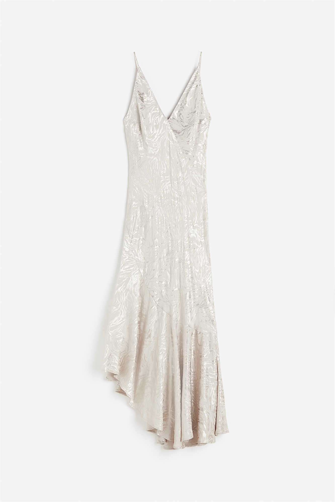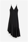 Приталенное платье длиной до щиколоток из вискозного полотна с бретелями-спагетти и глубоким V-образным вырезом спереди и сзади. Асимметричный подол и закругленный шов на юбке создают эффект драпировки. Без подкладки.