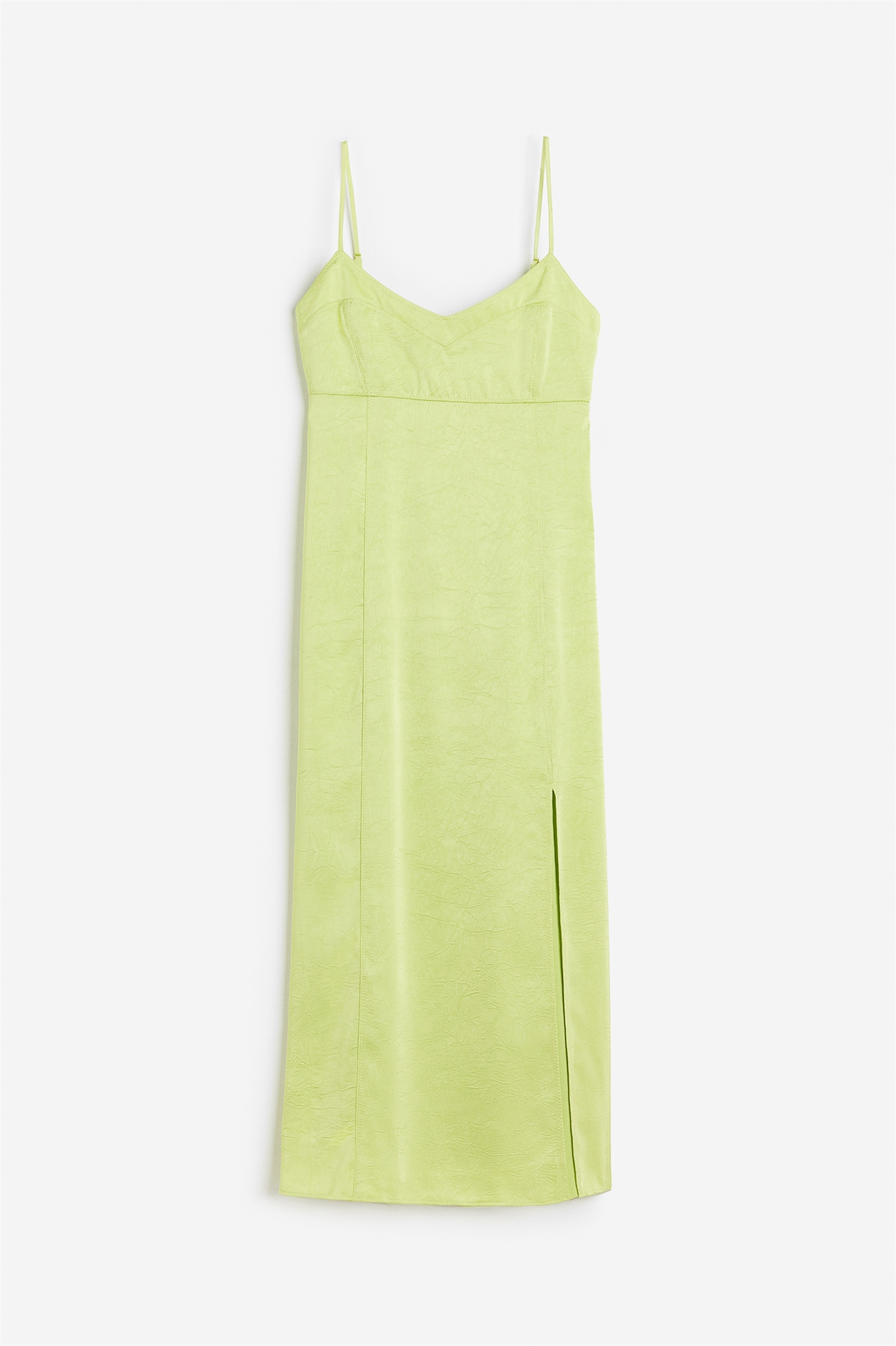 Приталенное платье длиной до колена с вырезом в форме сердца и узкими регулируемыми бретелями. Открытый разрез сзади с эластичной вставкой в верхней части и потайной застежкой-молнией с одной стороны. Подол прямого покроя с высоким разрезом спереди. На подкладке в области бюста.