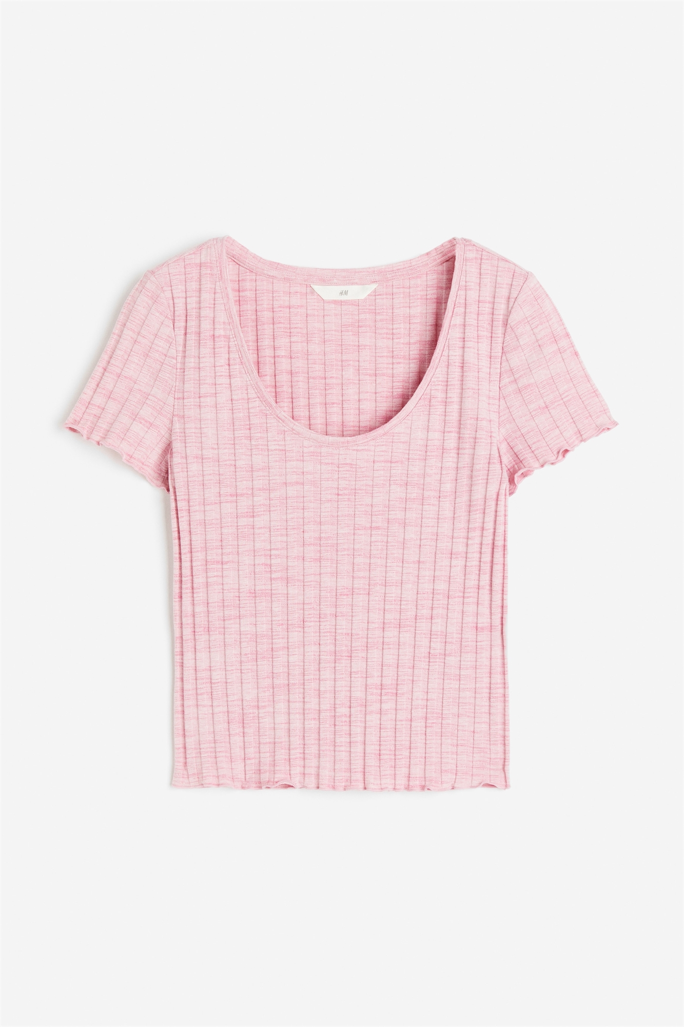 Короткая приталенная футболка из ребристого трикотажа с глубоким круглым вырезом и оверлоками на манжетах и подоле.