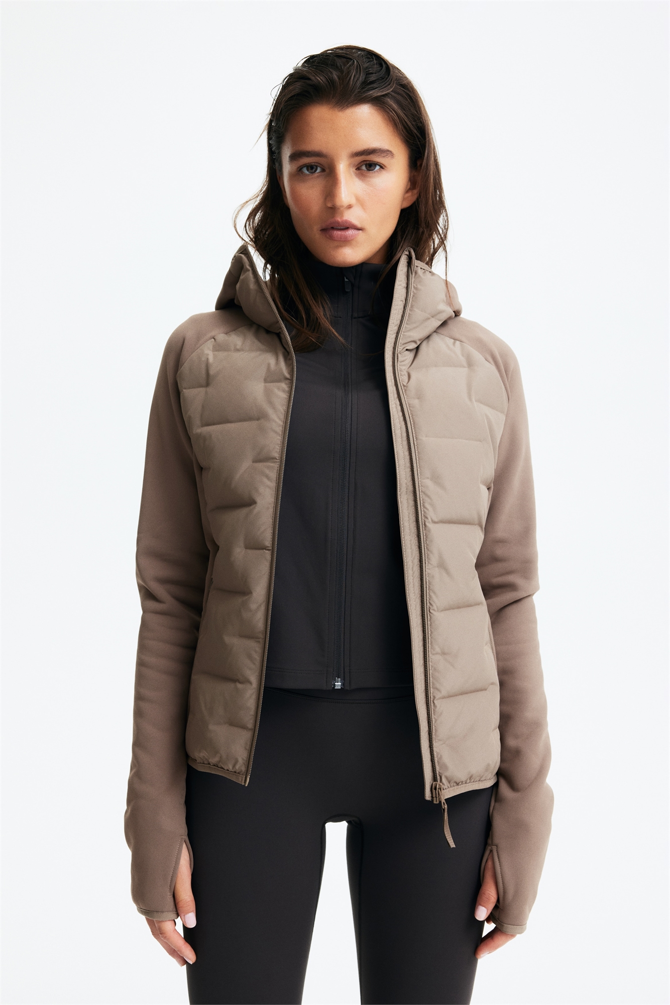 Гибридная куртка из эластичной ткани и мягких панелей из функциональной ткани ThermoMove™, которая согреет вас при понижении температуры. Регулярный крой с капюшоном на подкладке и застежкой-молнией спереди с защитой подбородка от натирания. Удлиненные рукава реглан с отверстием для большого пальца на манжетах, открытые внутренние карманы и боковые карманы на молнии для безопасного хранения ценных вещей. Эластичная отделка капюшона, манжет и подола. Куртка имеет наполнитель из пуха и пера. На подкладке.