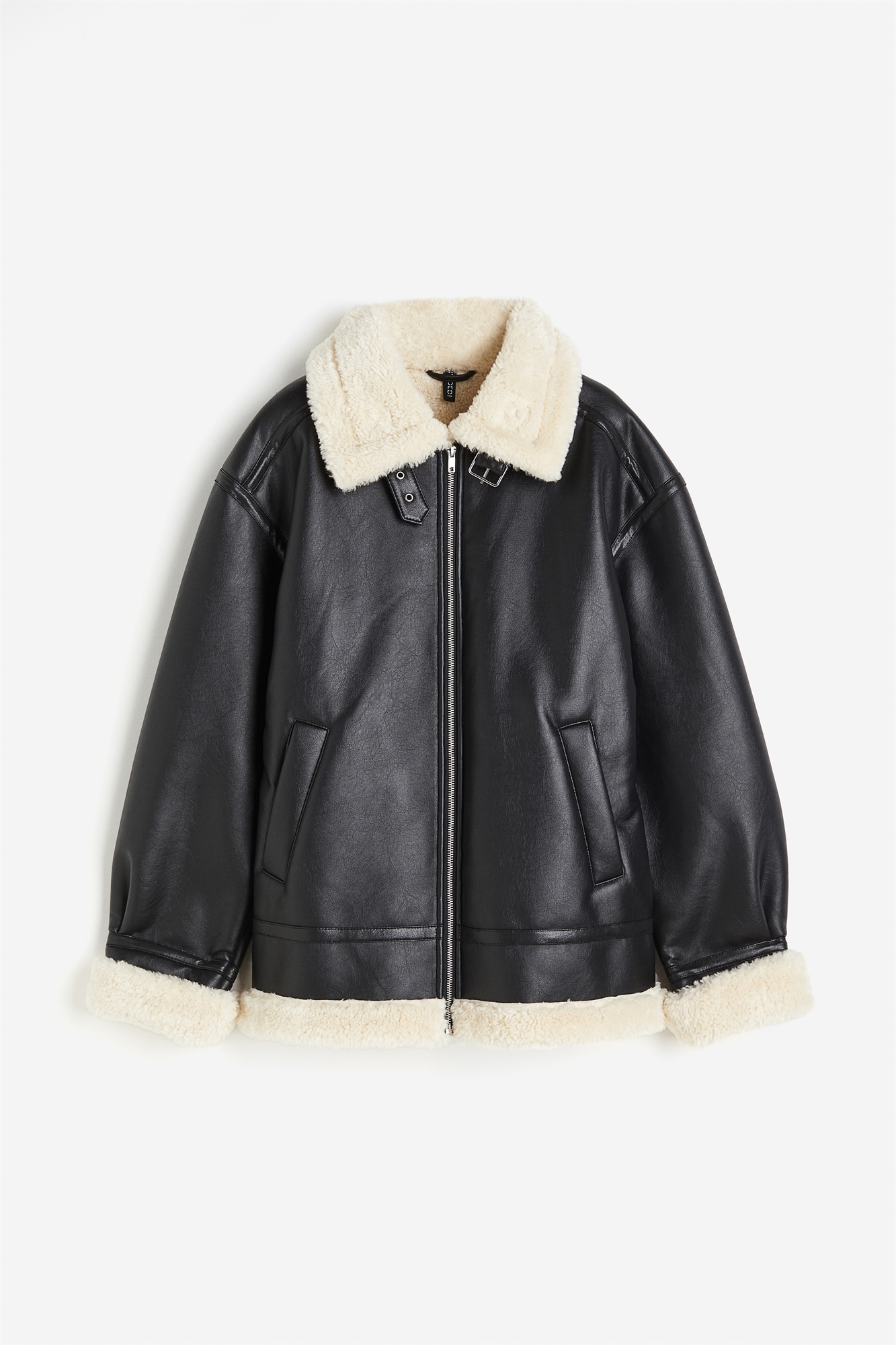 Куртка в стиле оверсайз с большим воротником, манжетами, подолом и подкладкой из мягкого тедди. Застежка-молния спереди, длинные рукава и диагональные карманы спереди. Воротник с регулируемой планкой и металлическими пряжками.