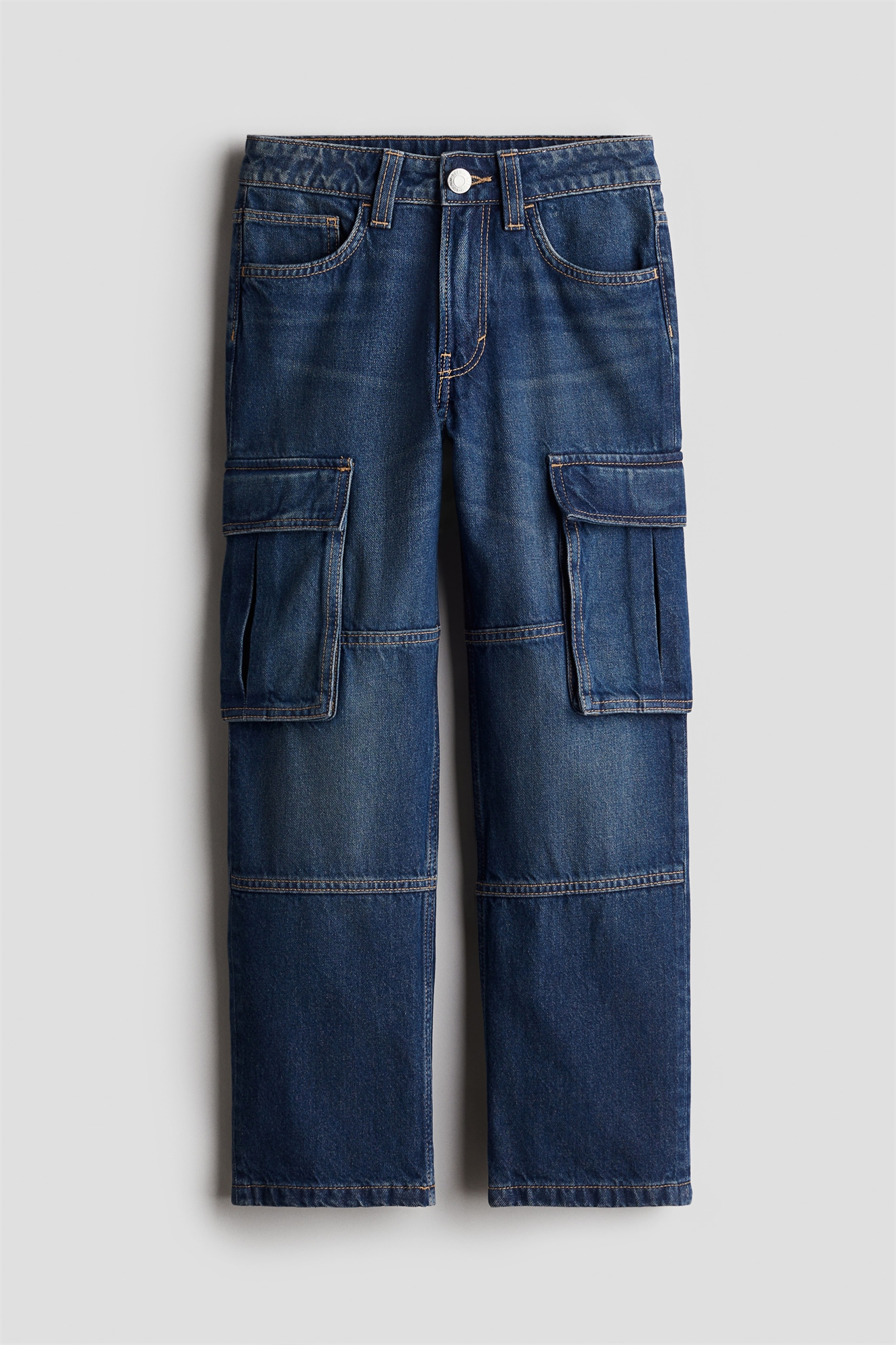 Джинсы из моющегося хлопкового денима со свободным кроем в области бедер и ляжек и прямыми ногами. Регулируемая резинка на талии для идеальной посадки, ширинка на молнии и пуговице. Передние карманы, карман для монет, открытые задние карманы и накладные карманы на ногах.