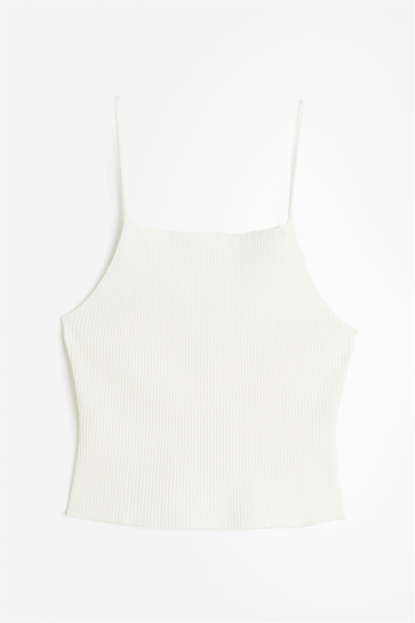 Короткий приталенный топ из трикотажа в рубчик с квадратным вырезом и узкими бретелями.