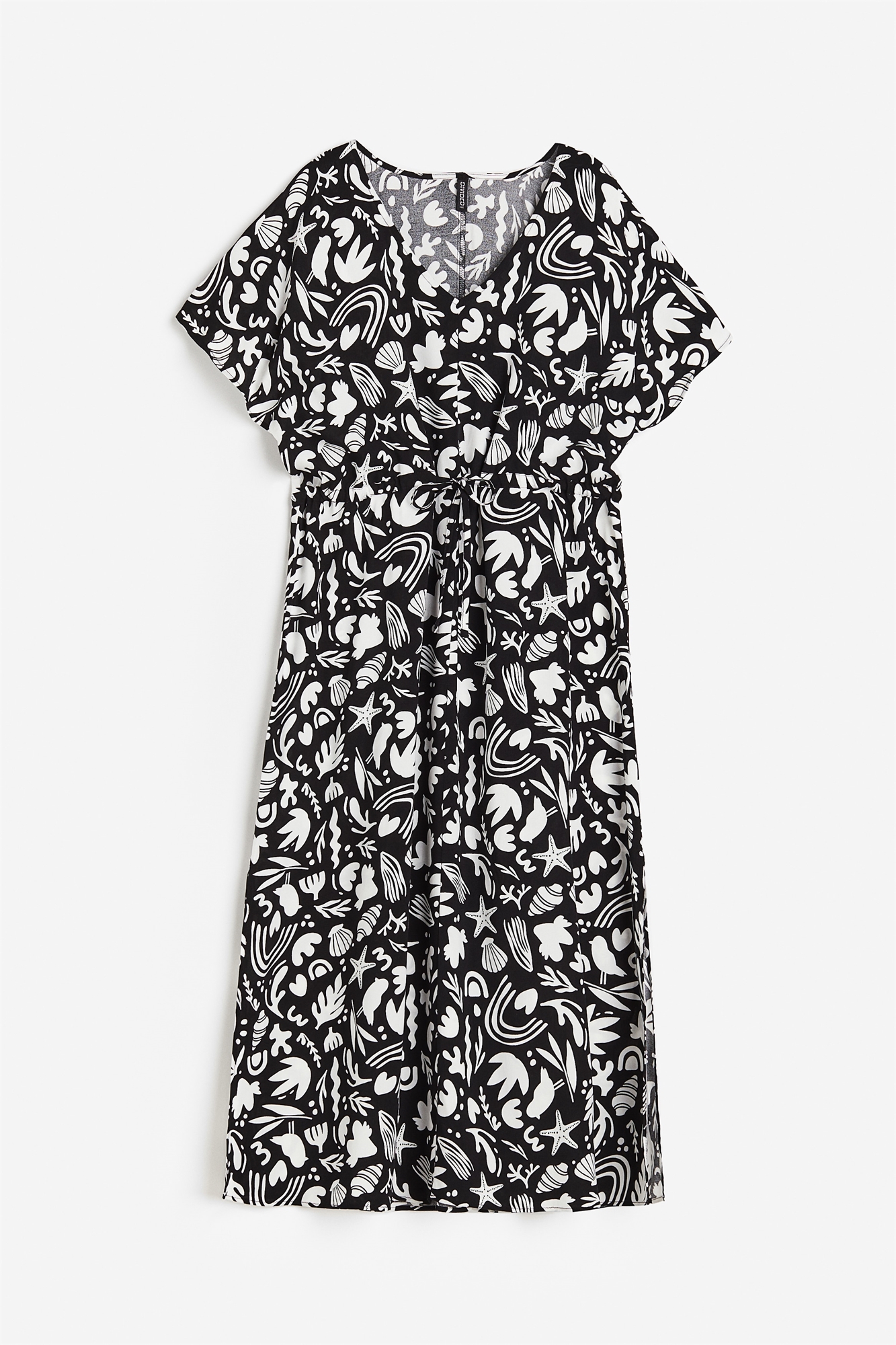 Платье длиной до колена из воздушной вискозной ткани. С V-образным вырезом, короткими рукавами-бабочками и завязкой спереди. Прямой подол. Без подкладки.
