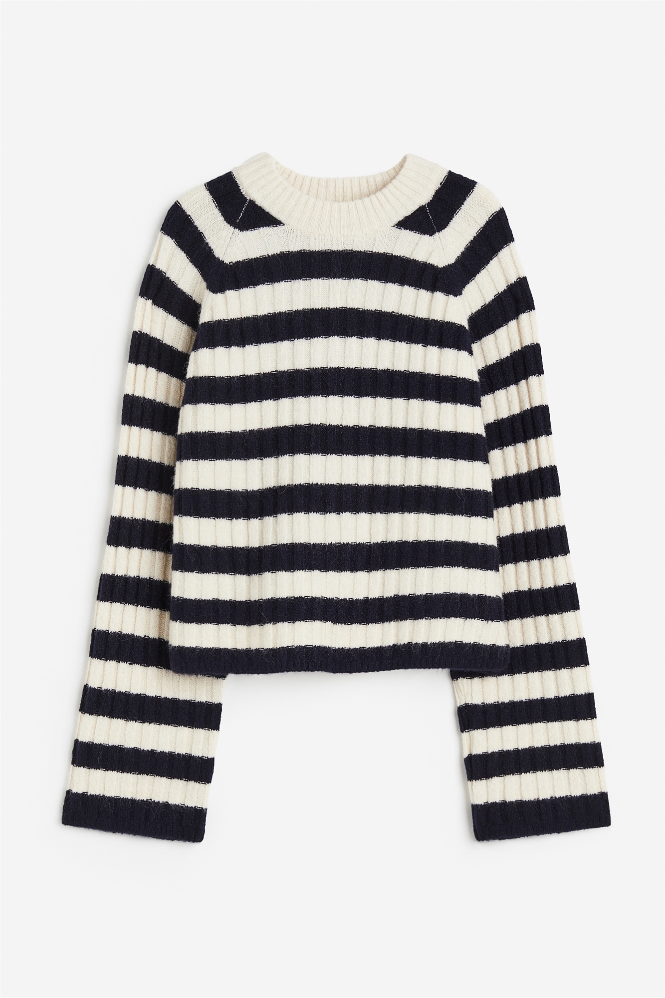 Слегка укороченный джемпер из мягкого трикотажа в рубчик с круглым ребристым вырезом и длинными рукавами реглан.