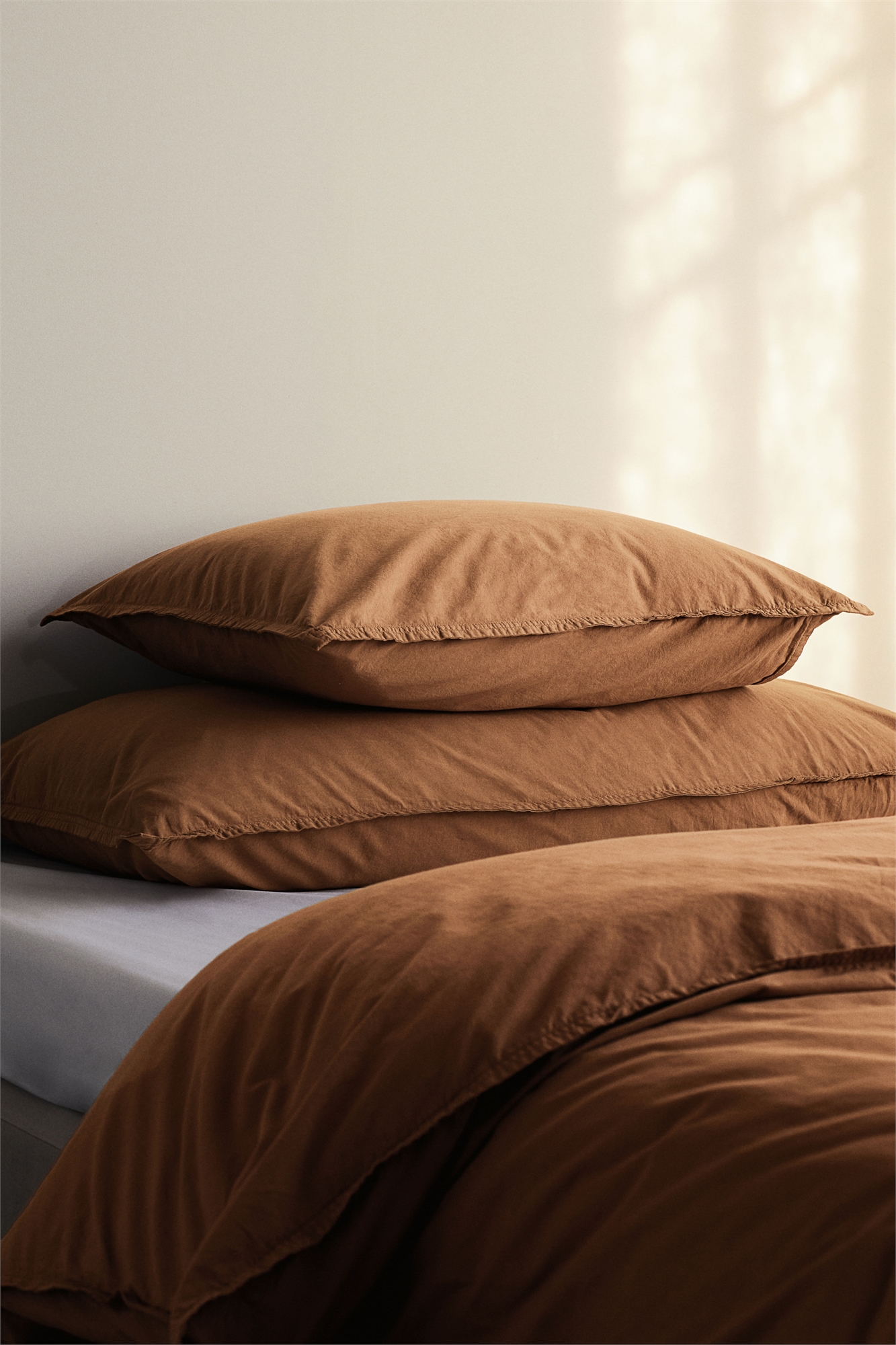 Односпальный комплект постельного белья из стираного хлопкового полотна с количеством нитей 143. Пододеяльник застегивается снизу на пуговицы. Одна наволочка с отверстием для конверта.