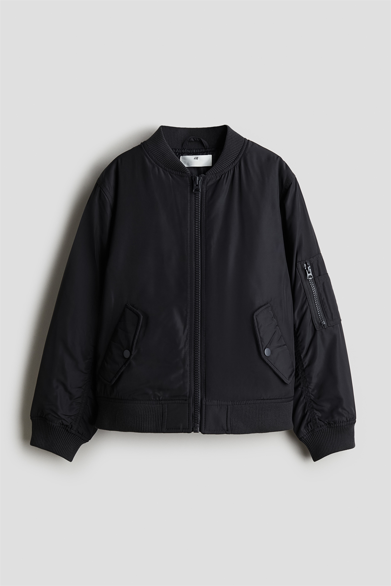 Куртка-бомбер из тканого материала с небольшим ребристым воротником, застежкой-молнией спереди, слегка спущенными плечами и заметными сборчатыми швами на рукавах. Накладные передние карманы с кнопками, карман на молнии, манжеты и подол в рубчик. На подкладке.