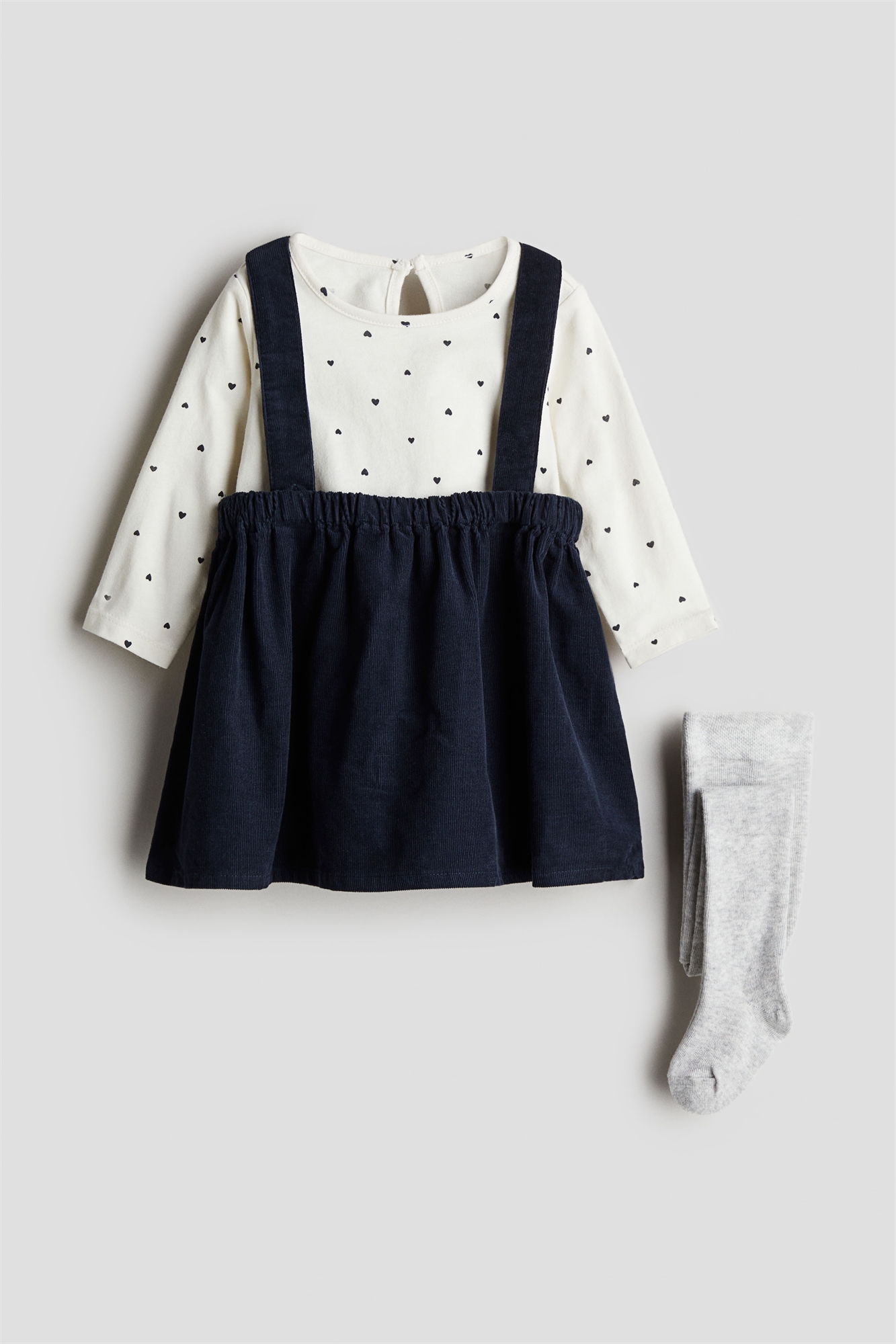 Комплект из топа и юбки с координирующими колготками. Топ с длинными рукавами из мягкого трикотажа с круглым вырезом и отверстием для ключа с пуговицей сзади. Юбка из вельвета с мягкой, регулируемой эластичной резинкой на талии и съемными лямками, перекрещивающимися сзади. Колготки из тонкого трикотажа с мягкой эластичной резинкой на талии.