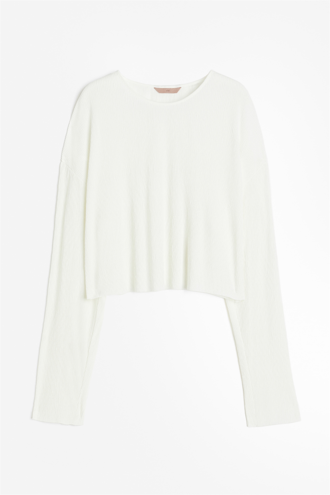 Короткая рубашка из мятого трикотажа. Свободный крой. С круглым вырезом, спущенными плечами и длинными рукавами.
