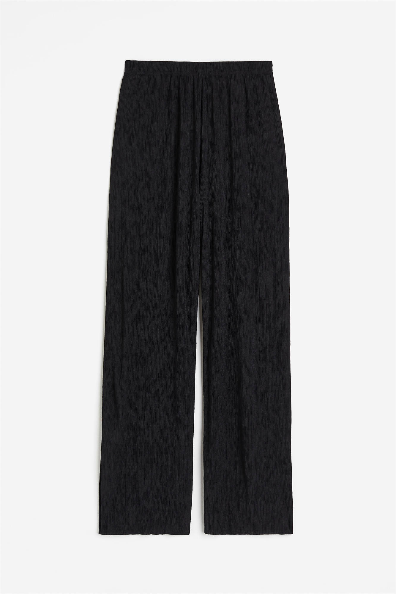 Брюки из мятого трикотажа. Свободный крой с высокой эластичной талией и широкими прямыми ногами.