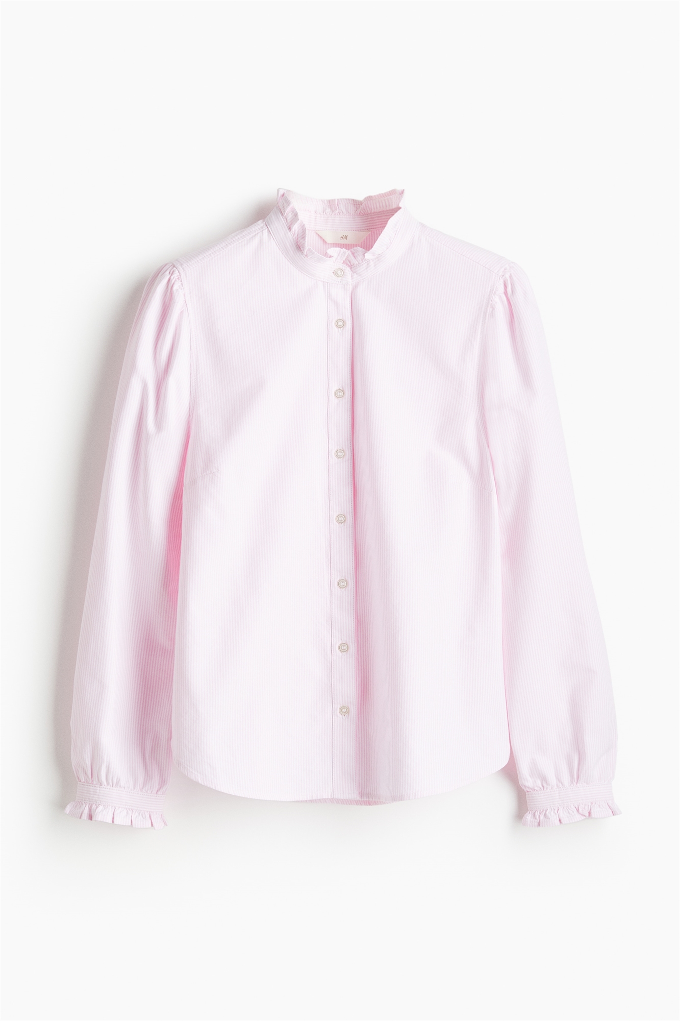 Приталенная блузка из стираного оксфордского хлопка с воротником "дедушка" с отделкой жабо и пуговицами спереди. Длинные пышные рукава и узкие манжеты с оборкой и пуговицей. Закругленный подол.