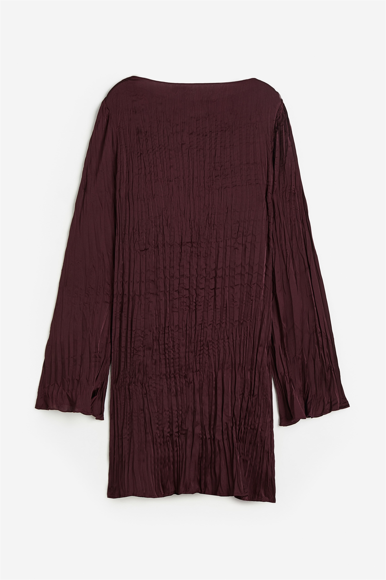Короткое платье из плиссированного атласа с элегантным вырезом-лодочкой и длинными рукавами-трубами. Оверлочные края по вырезу и на манжетах. Без отделки.