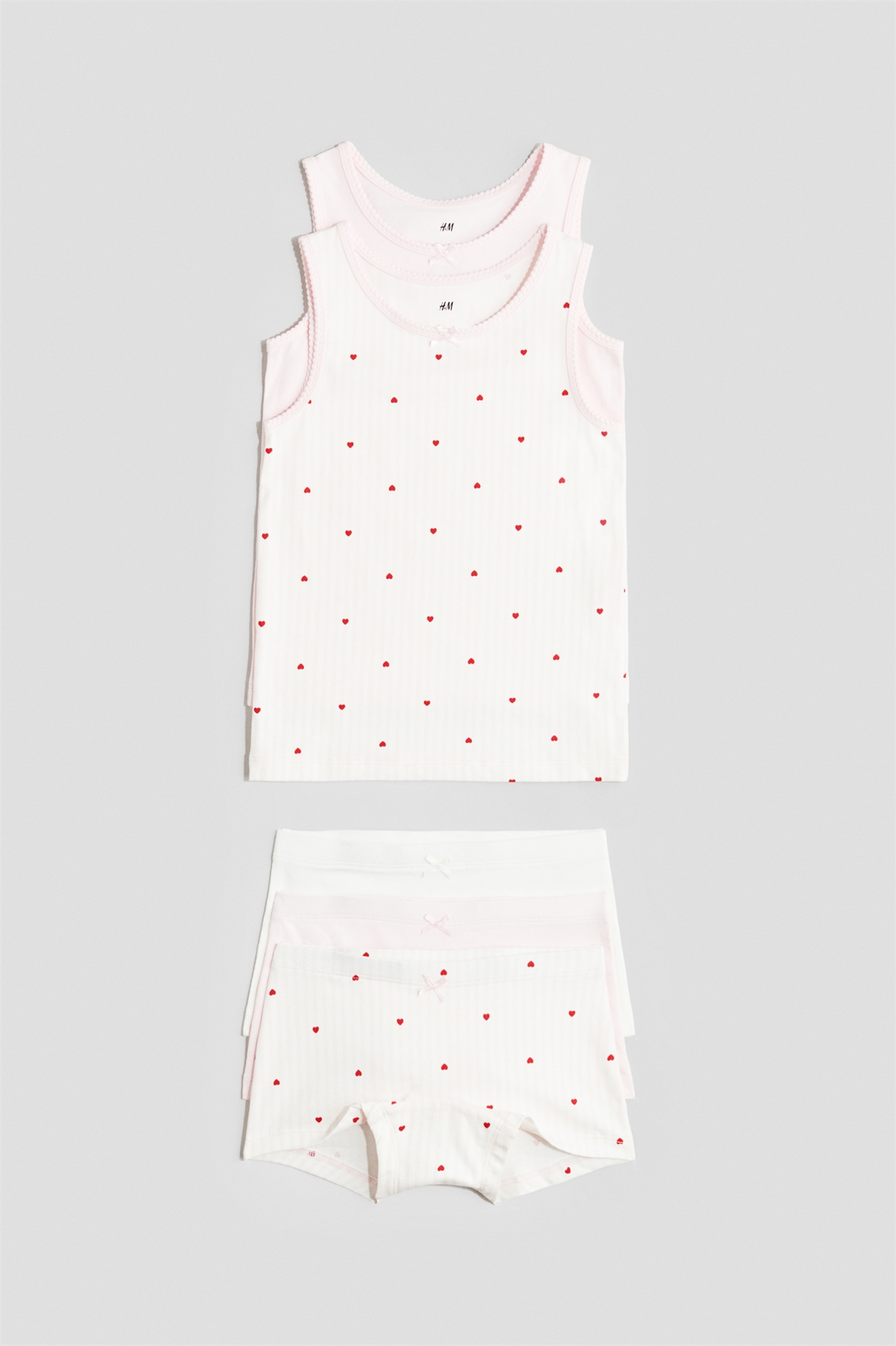 Комплект из двух жилетов и трех пар трусов из мягкого хлопкового джерси. Жилеты с отделкой пико по вырезу горловины и проймам. Трусы с эластичным поясом и ластовицей.