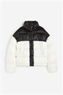 Стеганый пуховик с воротником-стойкой, застежкой-молнией и ветрозащитным клапаном с кнопками для прижима спереди. Свободный крой с опущенными плечами, втачными передними карманами, эластичными манжетами и эластичным шнурком со стопорами на подоле. На подкладке.