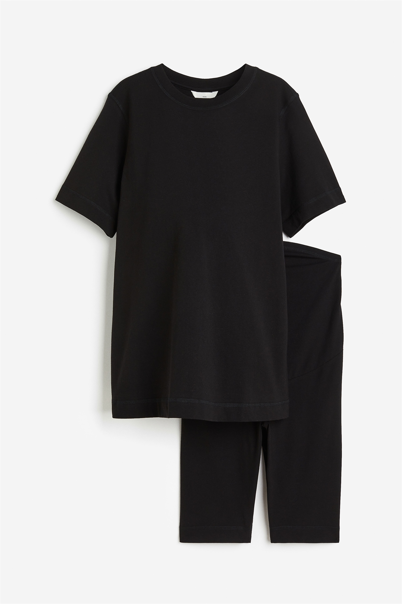 Удобный комплект из футболки и пары велосипедных шорт из мягкого хлопкового джерси. Шорты длиной до колена с широкой панелью из джерси на талии для лучшей посадки на животике.