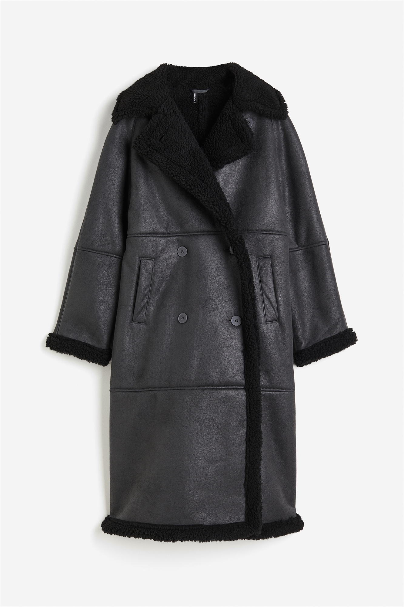 Двубортное пальто длиной до колен с большим воротником, широкими лацканами, манжетами, краями и подкладкой из мягкого тедди. Свободный крой с пуговицами спереди, длинные рукава реглан и втачные передние карманы.