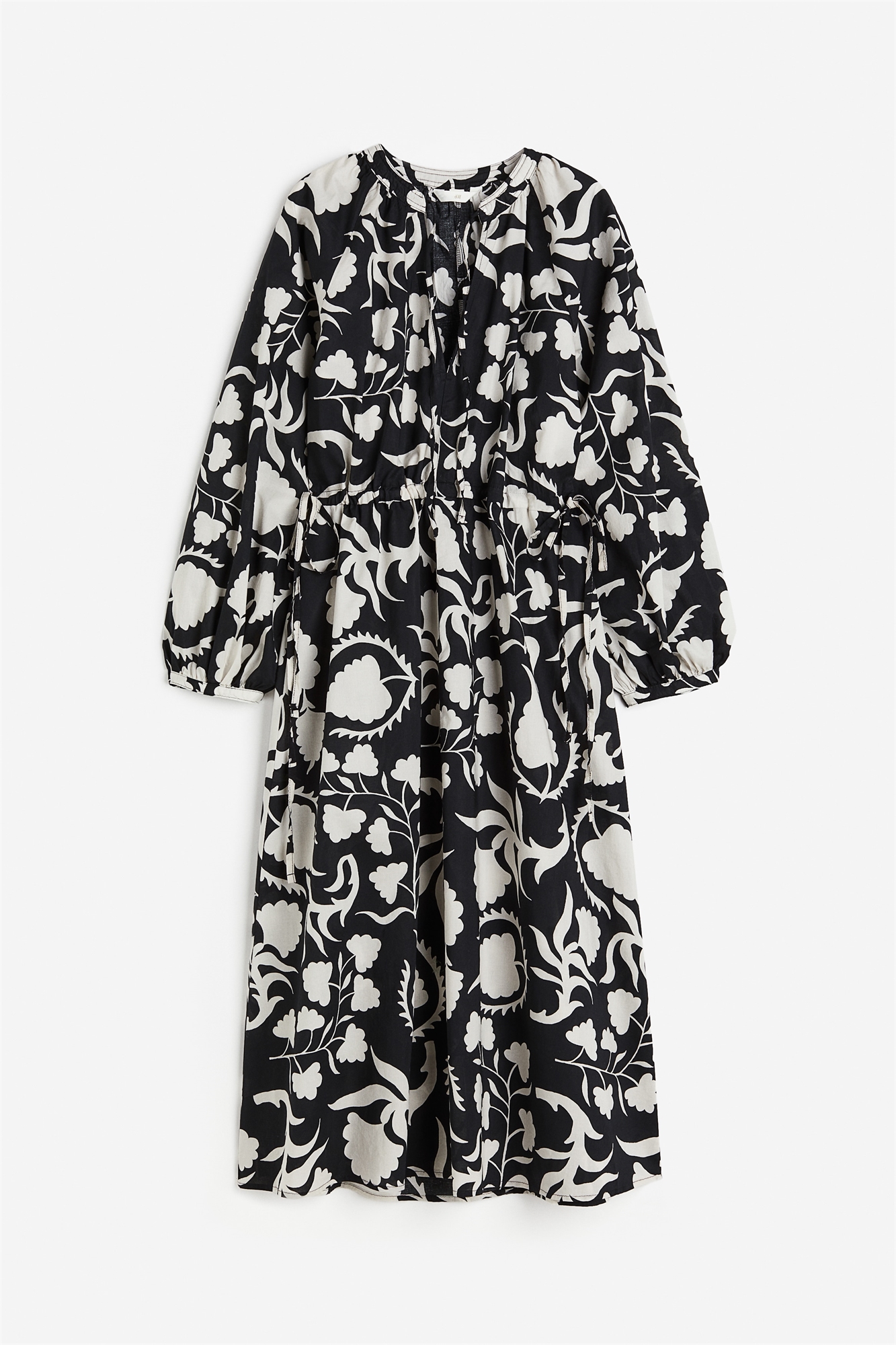 Платье длиной до колен из воздушного хлопкового полотна. Свободный крой с круглым вырезом и V-образной проймой с узкими завязками в верхней части. Длинные объемные рукава-баллоны с узкими манжетами на пуговицах. Узкие шнурки на талии, завязывающиеся по бокам. Без подкладки.