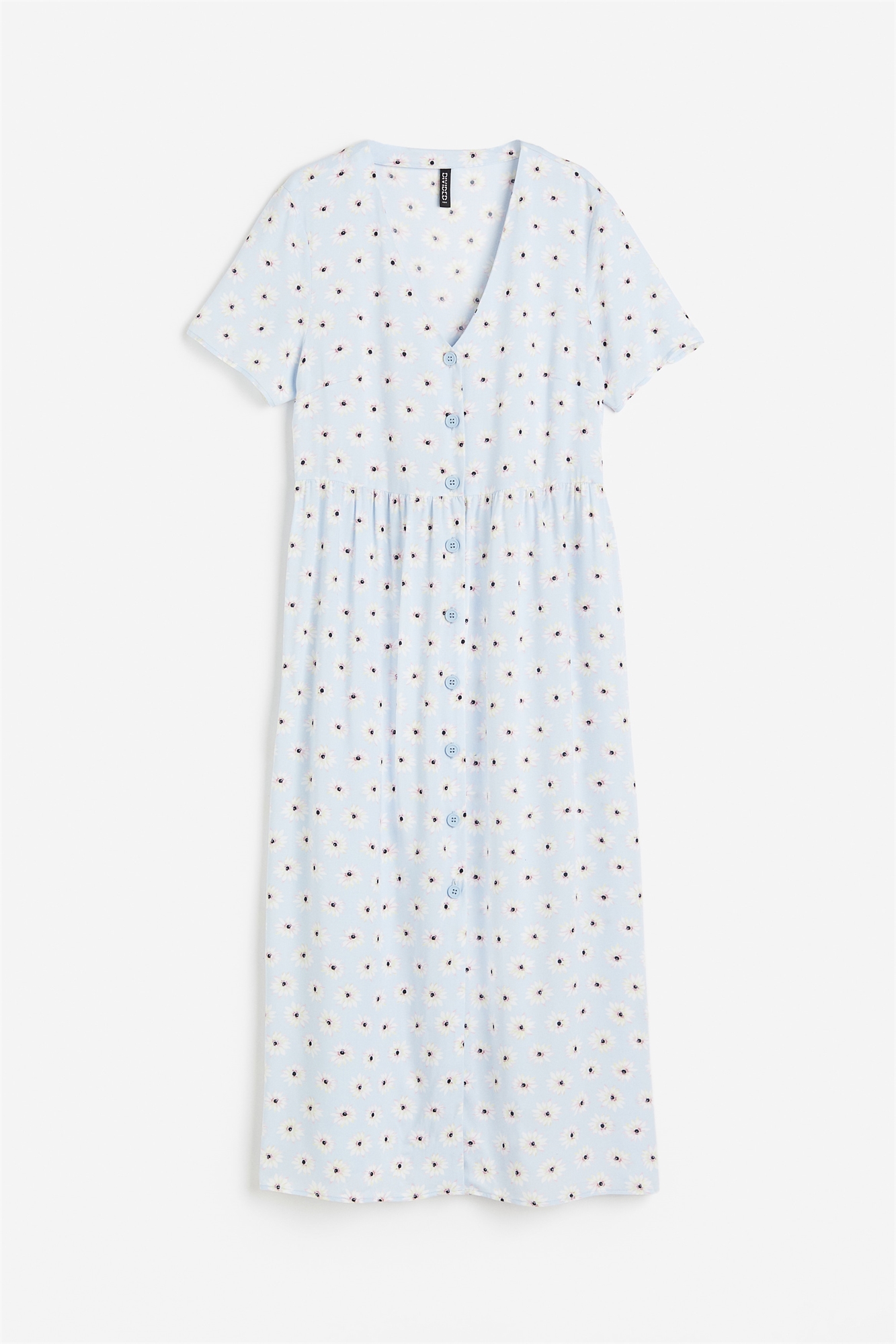 Платье из ткани на пуговицах длиной до колен с V-образным вырезом горловины, короткими рукавами и сборчатым разделительным швом. Свободный крой. Без подкладки.