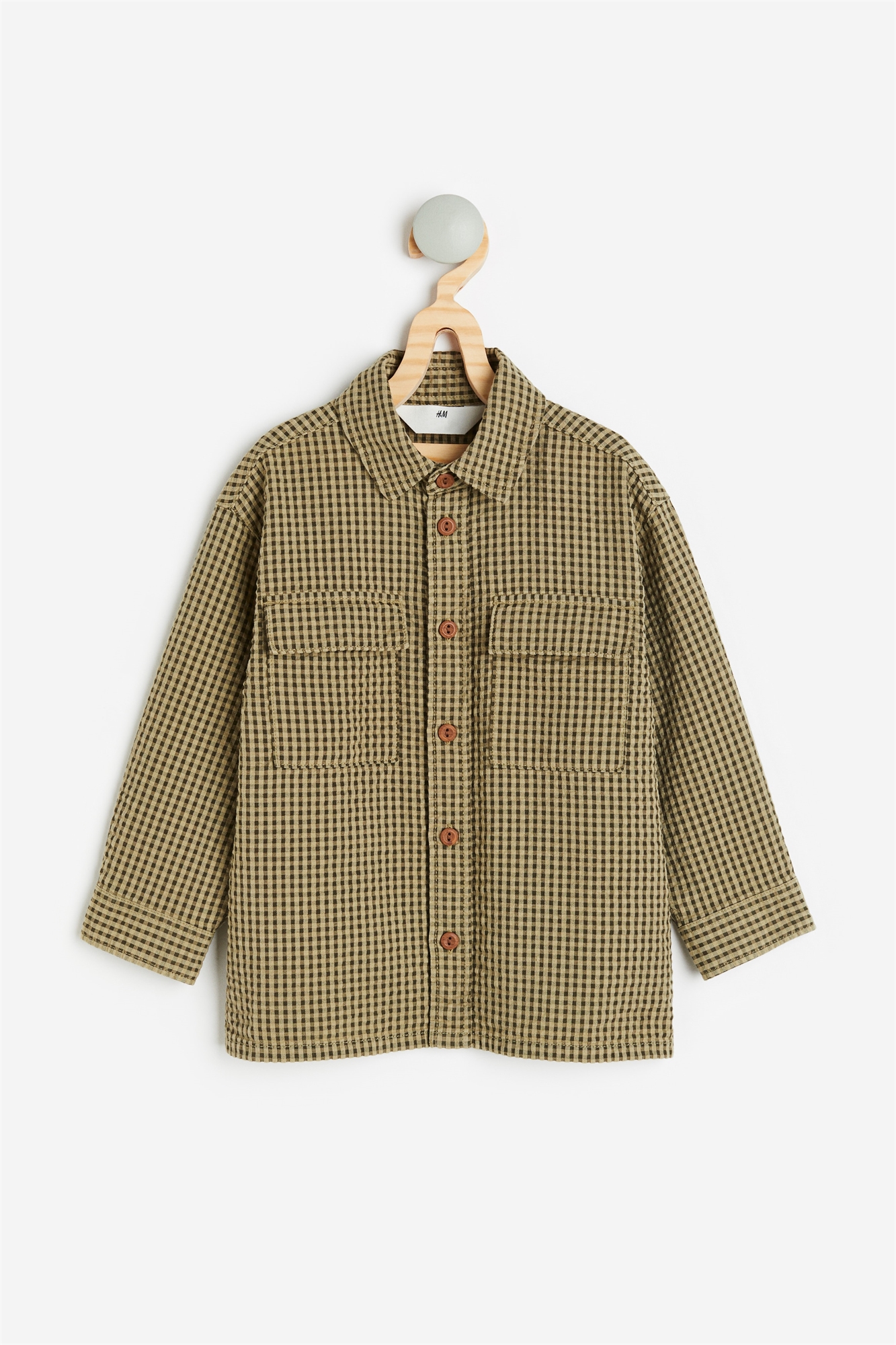 Детский эксклюзив. Рубашка больших размеров из хлопкового ситцевого полотна с воротником, спущенными плечами и пуговицами под дерево спереди. Накладные нагрудные карманы и длинные рукава с манжетами на пуговицах.