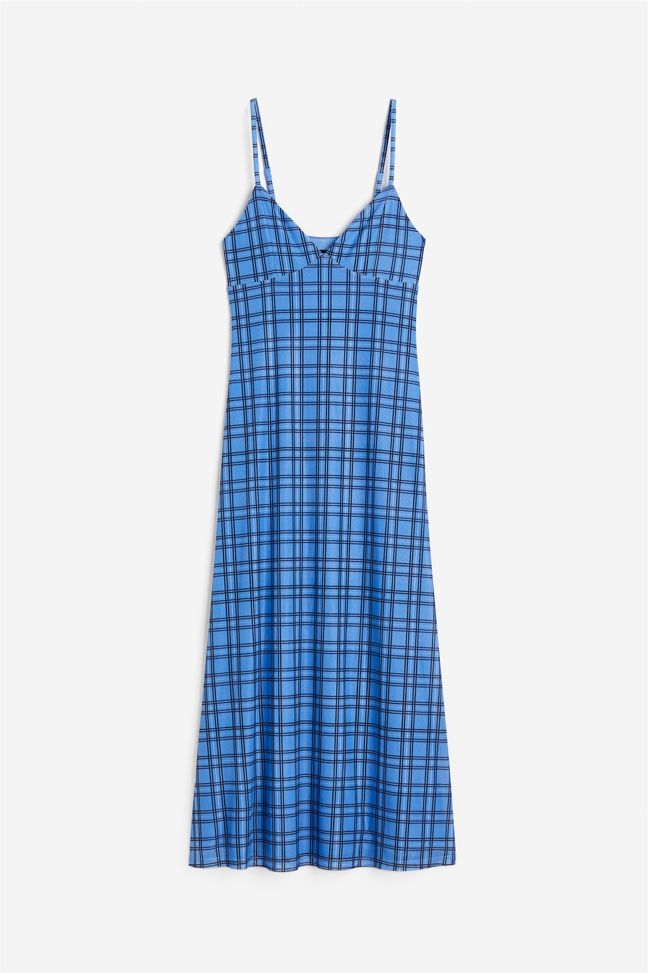 Платье длиной до колен из узорчатой сетки с V-образным вырезом, формованными чашечками и узкими регулируемыми бретелями. Облегающий лиф и слегка расклешенная юбка. Подкладка из джерси.