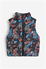 Пуховик-жилет из стеганого полотна с принтом по всей поверхности. Воротник-стойка, застежка-молния спереди с защитой подбородка от натирания, прорезные карманы спереди и эластичные вставки по подолу. На подкладке.