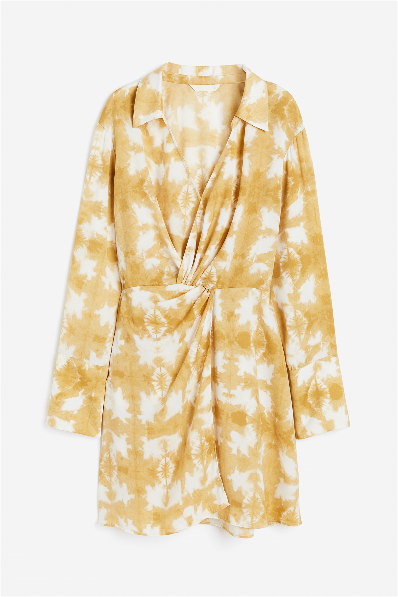 Короткое платье из тканого материала с легким блеском. Воротник и глубокая V-образная пройма с потайной застежкой на крючки и глазки спереди. Эластичный шов на талии сзади и перекрученная деталь спереди, создающая эффект драпировки. Длинные рукава и широкие манжеты с разрезом и пуговицей. Пришитая юбка. Без подкладки.