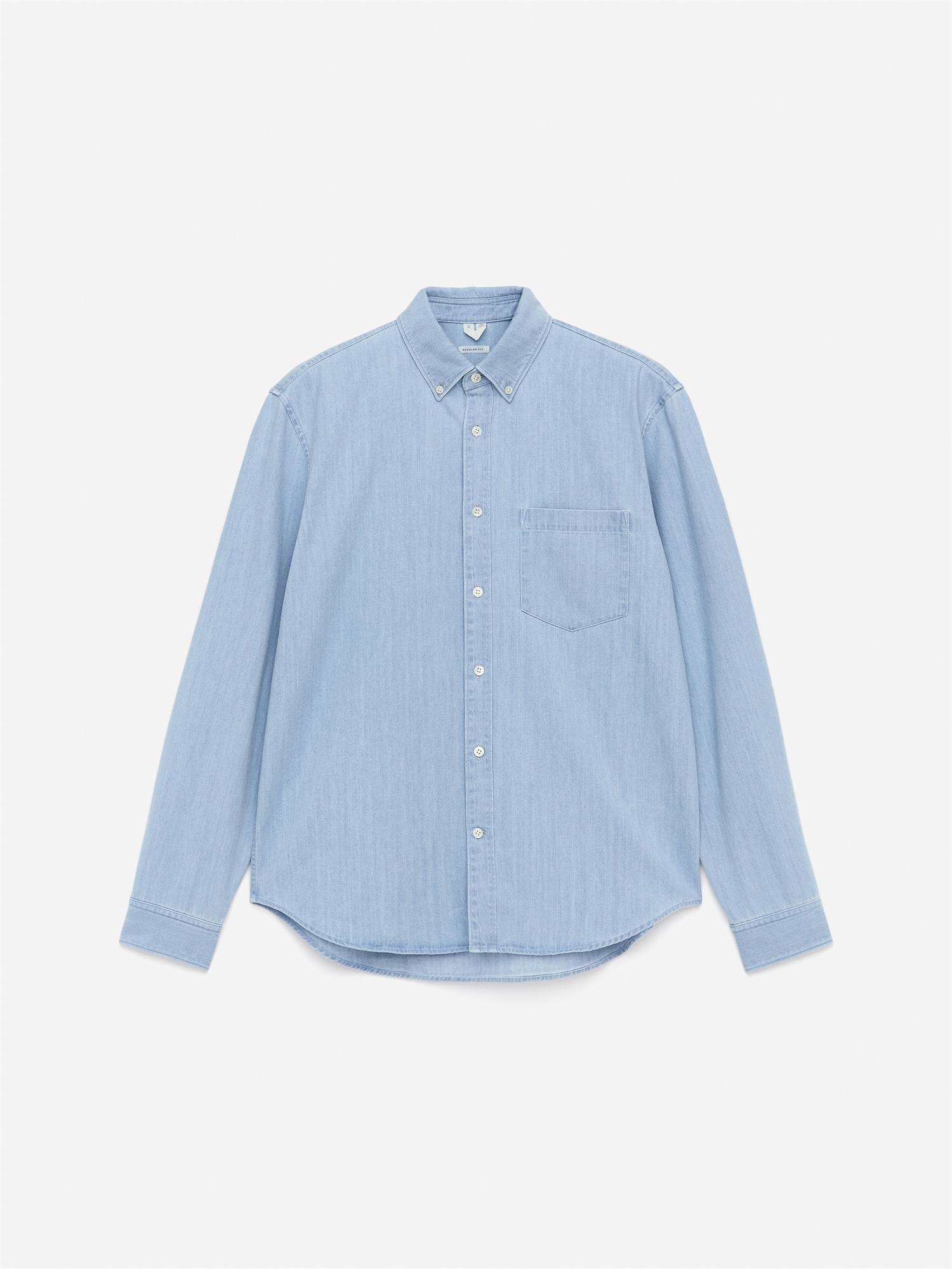 Джинсовая рубашка на пуговицах с обычным кроем. Нагрудный карман и манжеты на пуговицах.