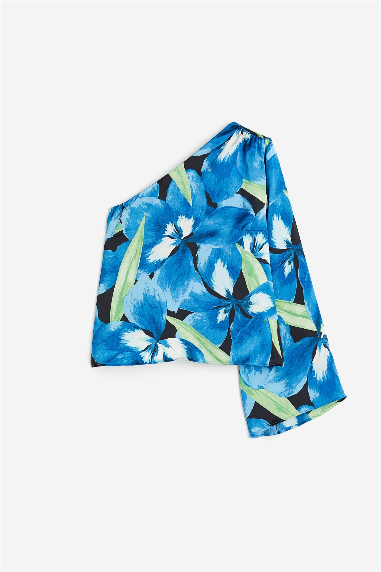 Блузка на одно плечо из тканого материала с асимметричным вырезом, сборками на плече и длинным расклешенным рукавом.