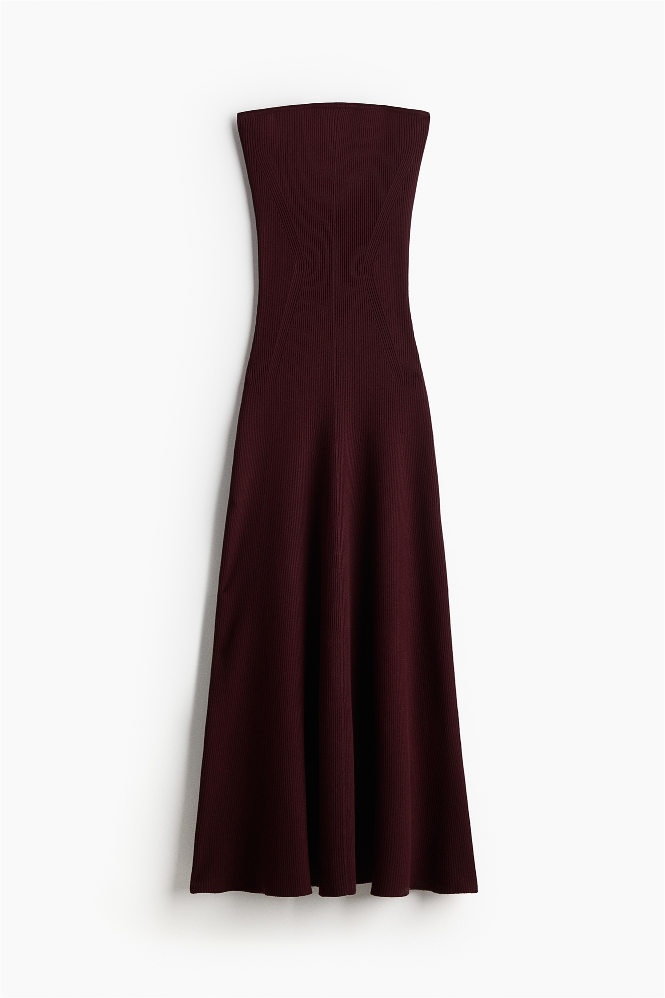 Платье-бандо длиной до щиколоток из трикотажа в рубчик со скрытой силиконовой отделкой в верхней части, которая удерживает его на месте. Облегающий лиф с цельнокроеным разрезом спереди и расклешенная юбка.