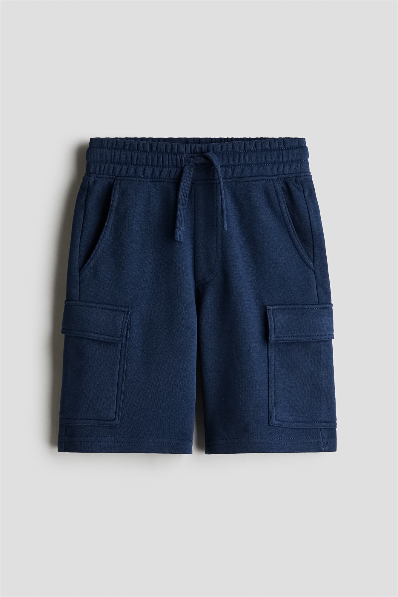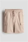 Шорты-карго длиной до колена из толстоватой ткани с мягким начесом внутри. Эластичная талия с утягивающим шнурком, фальшивая ширинка, диагональные боковые карманы и накладные карманы на ногах.