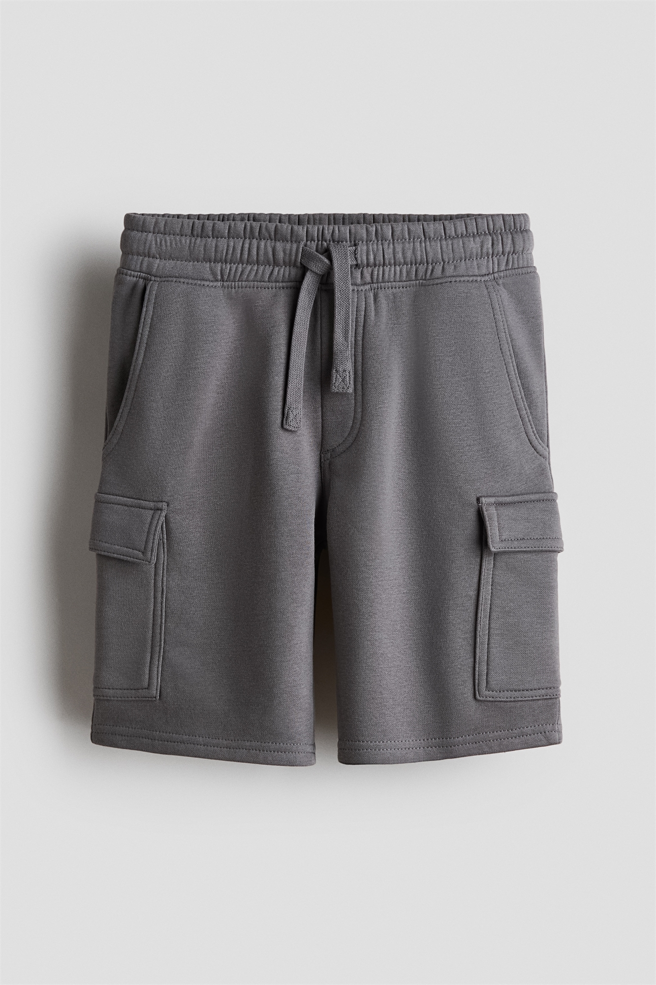 Шорты-карго длиной до колена из толстоватой ткани с мягким начесом внутри. Эластичная талия с утягивающим шнурком, фальшивая ширинка, диагональные боковые карманы и накладные карманы на ногах.