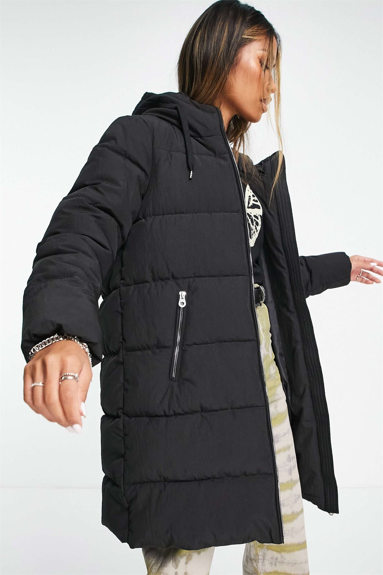 Длинное утепленное пальто с капюшоном черного цвета