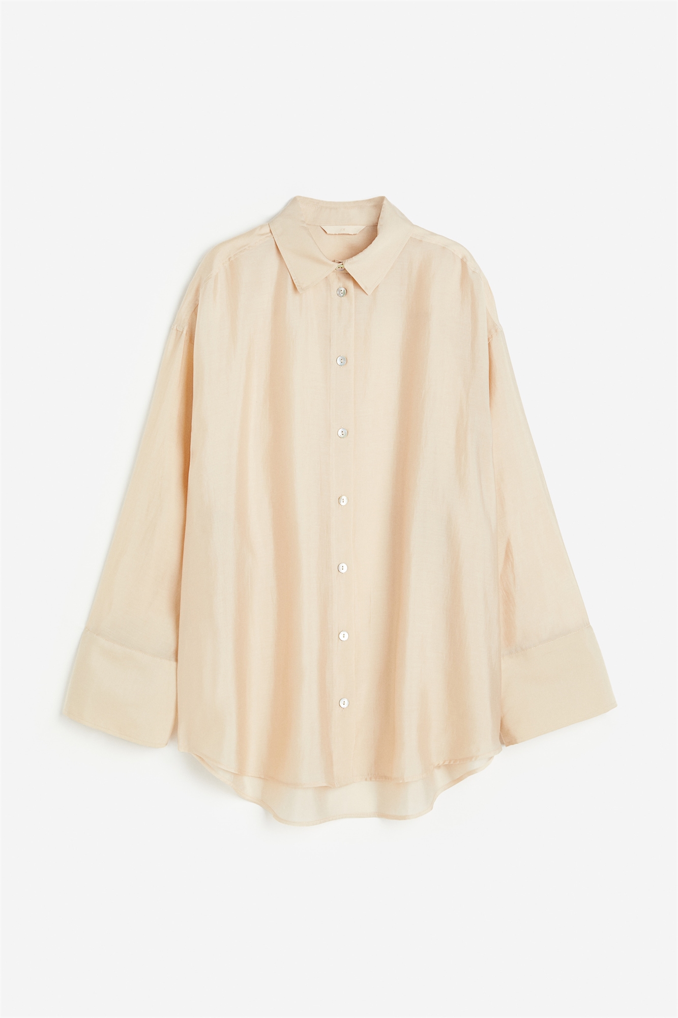 Блузка больших размеров из нежной смеси лиоцелла. С воротником, мерцающими перламутровыми пуговицами спереди и двухслойным ярмом со складками сзади. Спущенные плечи и длинные широкие рукава с разрезом и мерцающими перламутровыми пуговицами на манжетах. Закругленный подол, удлиненный сзади.