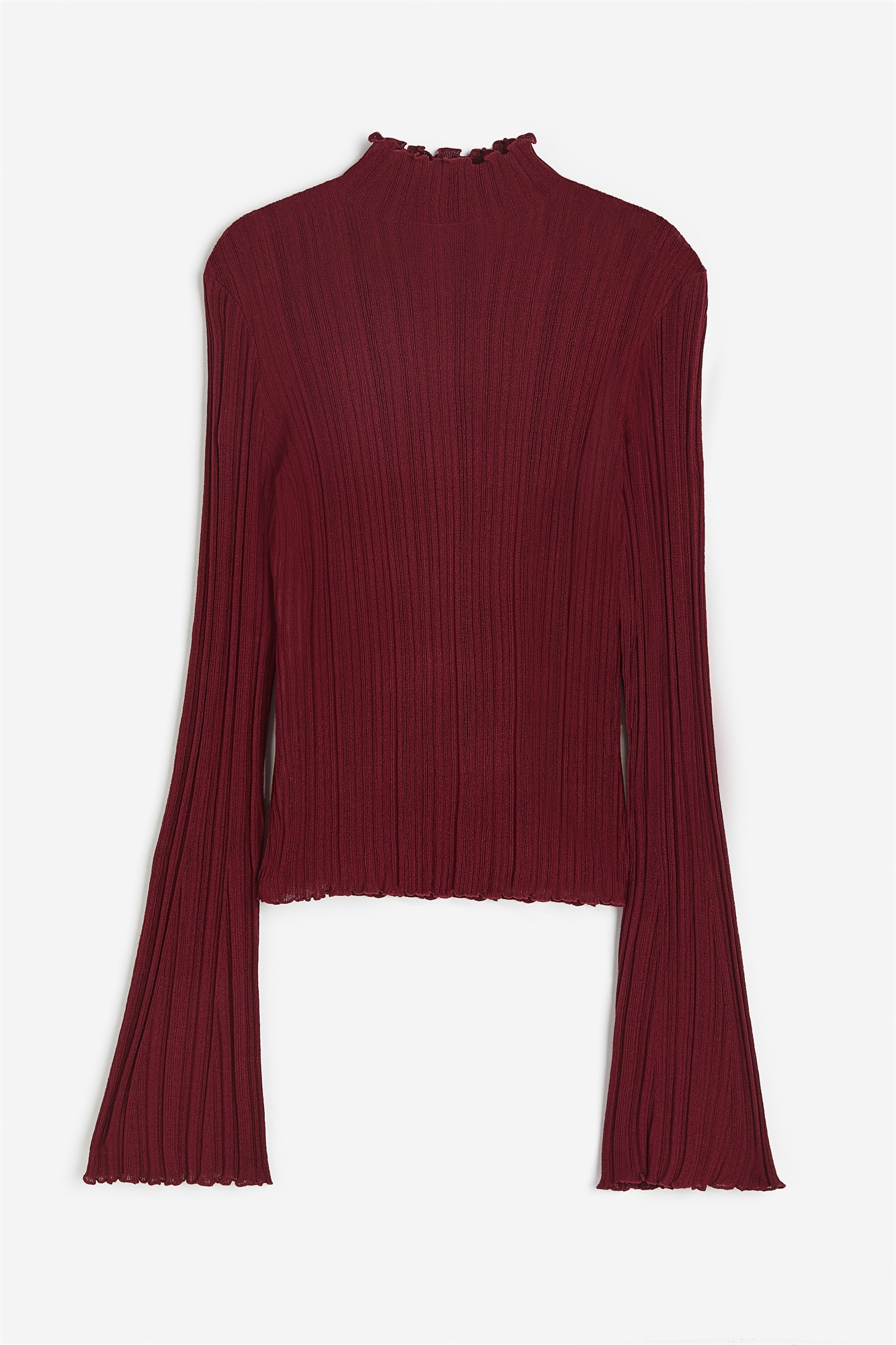 Облегающий топ из трикотажа в рубчик с черепаховой горловиной и длинными рукавами с расклешенными манжетами. Края обработаны оверлоком.