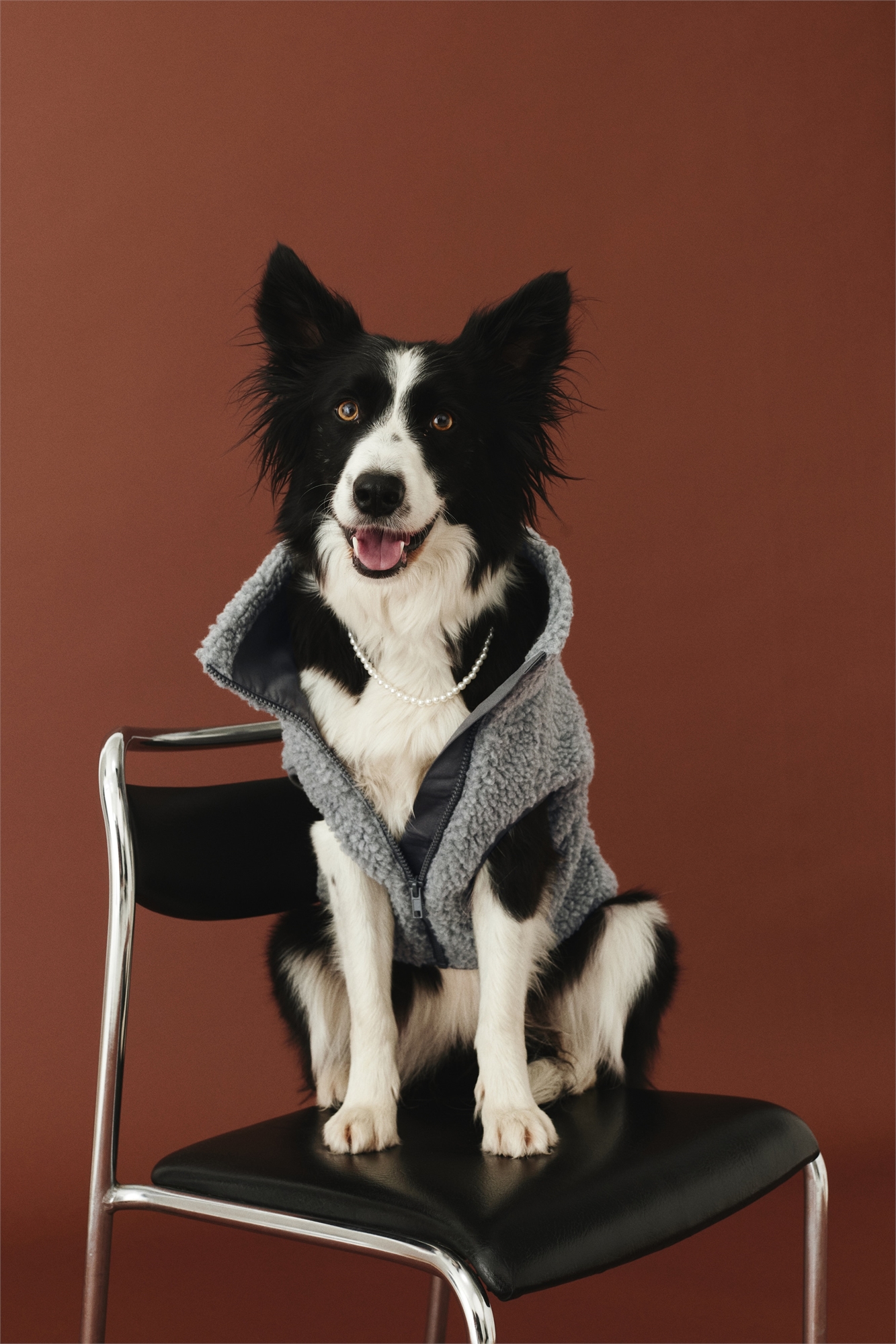Куртка для собак из мягкого тедди с деталями из тканого материала. Воротник-стойка и отверстие для поводка на шее сзади. Отверстия для передних лап и застежка-молния внизу. На подкладке.