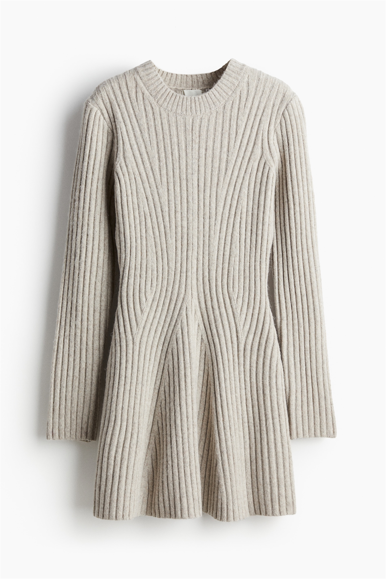 Короткое приталенное платье из мягкого трикотажа в рубчик с цельнокроеным разрезом спереди и сзади. Круглый вырез, слегка спущенные плечи, длинные рукава, расклешенные манжеты с разрезом и слегка расклешенная юбка.