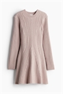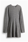 Короткое приталенное платье из мягкого трикотажа в рубчик с цельнокроеным разрезом спереди и сзади. Круглый вырез, слегка спущенные плечи, длинные рукава, расклешенные манжеты с разрезом и слегка расклешенная юбка.