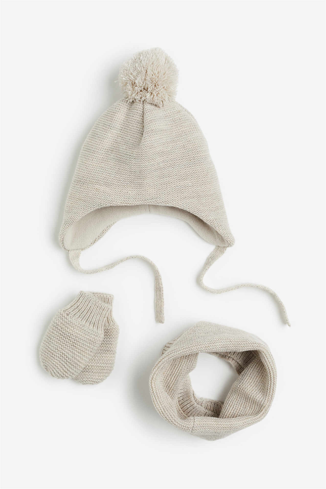 Комплект из шапки, шарфа-трубы и варежек из мягкого трикотажа. Шапка на флисовой подкладке с помпоном на макушке и завязками под подбородком. Варежки с ребристыми манжетами. Размер 0-6M без больших пальцев.