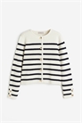 Приталенный кардиган из мягкого трикотажа с круглым вырезом и пуговицами золотистого цвета спереди. Длинные рукава с декоративными пуговицами на манжетах.