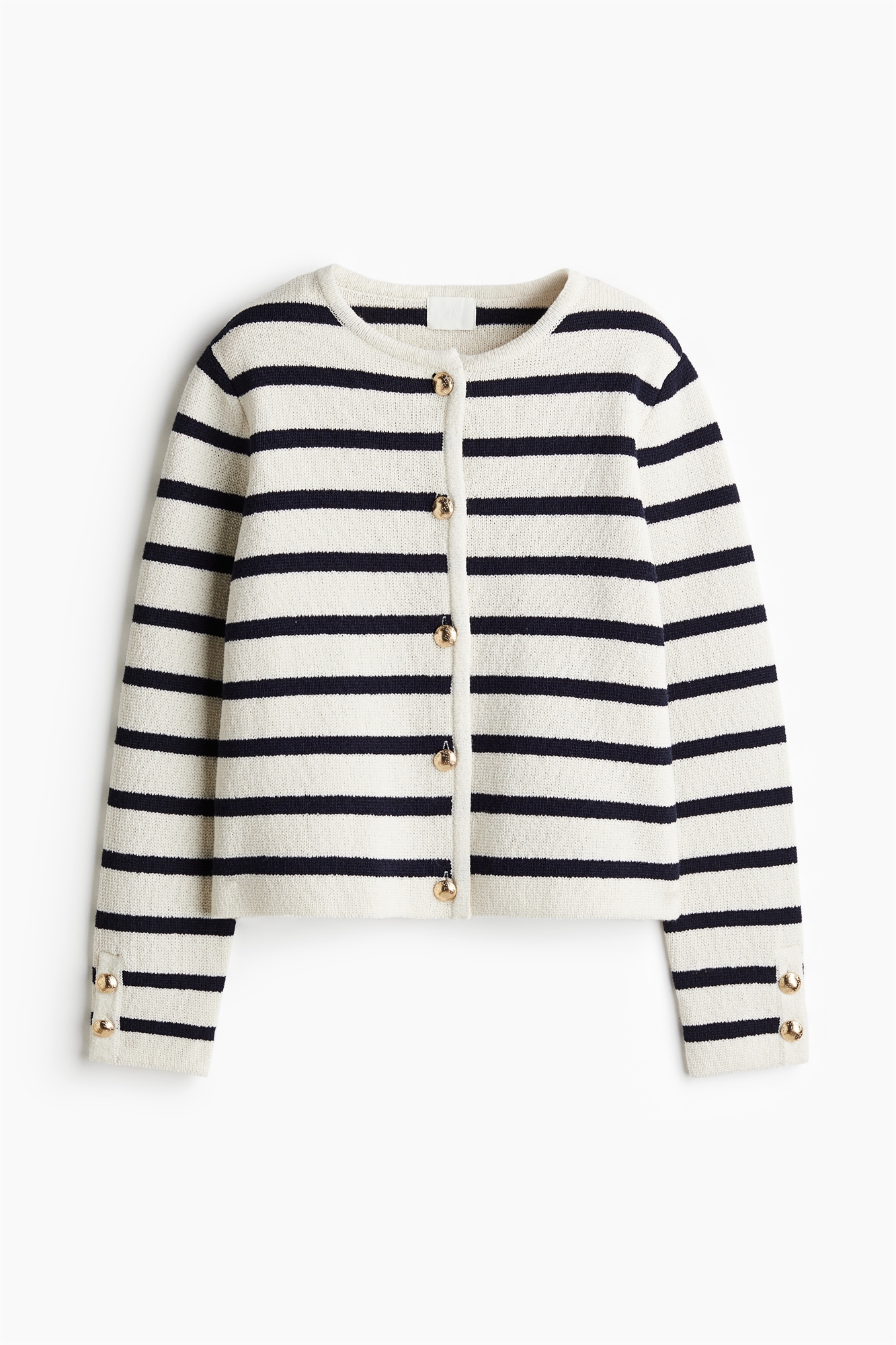 Приталенный кардиган из мягкого трикотажа с круглым вырезом и пуговицами золотистого цвета спереди. Длинные рукава с декоративными пуговицами на манжетах.