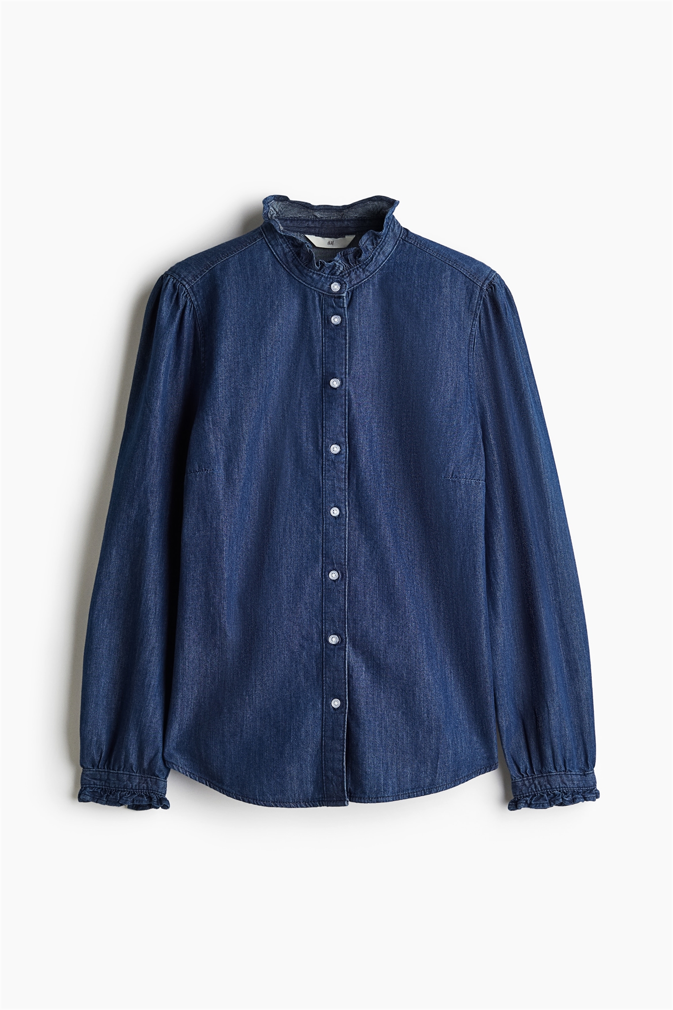 Приталенная блузка из хлопкового денима с воротником-стойкой с отделкой жабо и пуговицами спереди. Длинные пышные рукава с манжетами на пуговицах с оборками. Фигурные вытачки сзади и закругленный подол.