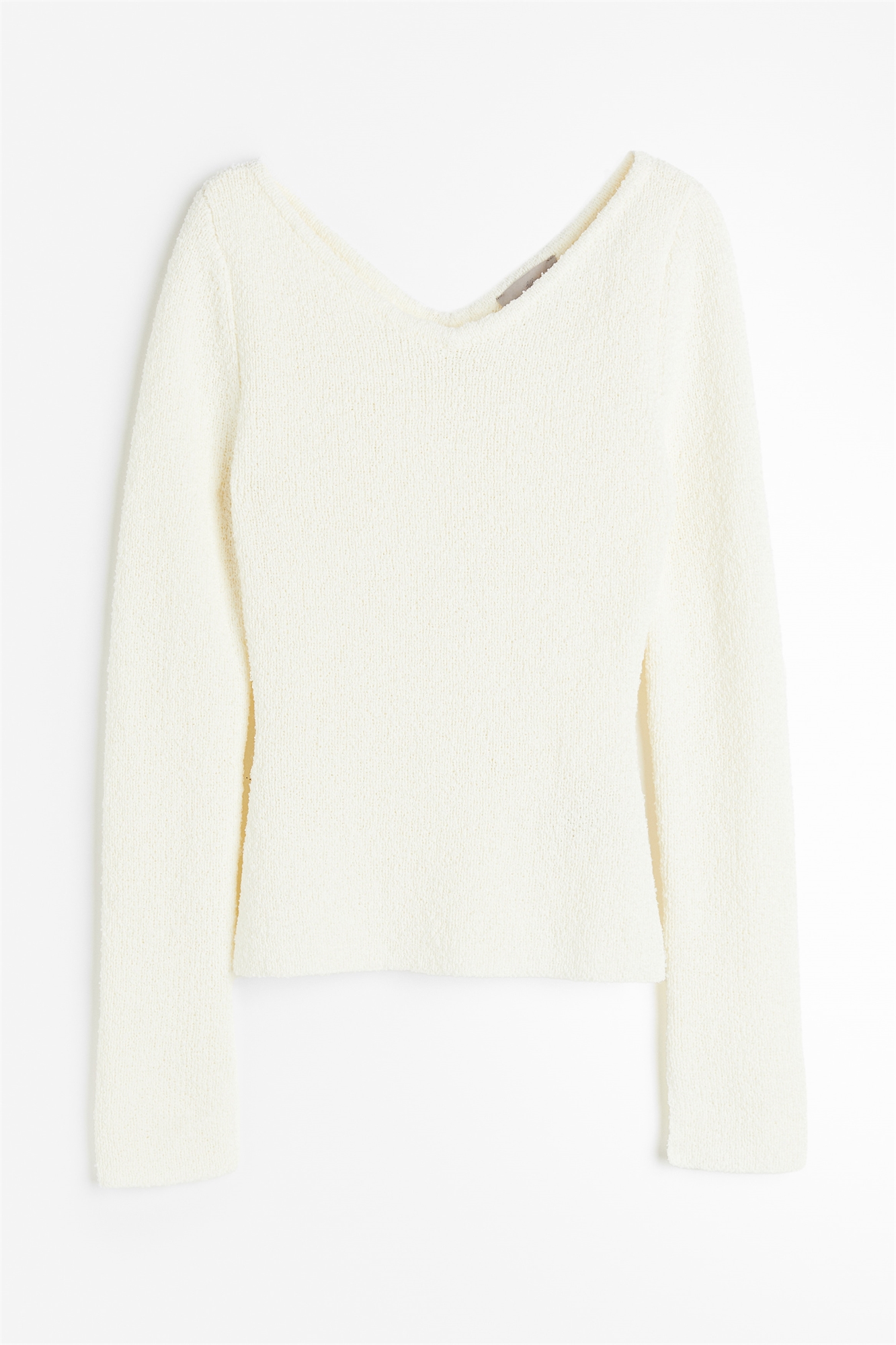 Облегающий топ из трикотажа букле с V-образным вырезом спереди и сзади и удлиненными рукавами с разрезом на манжетах.