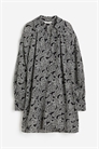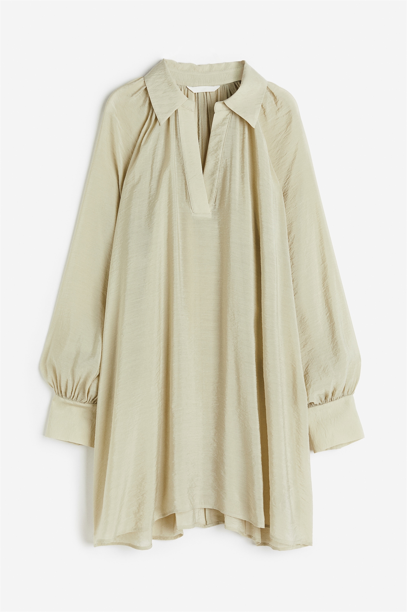 Короткое платье-туника из тонкого блестящего тканого материала. Свободный крой. С воротником, V-образной проймой спереди и длинными рукавами-баллонами кроя реглан с широкими манжетами на пуговицах. Без подкладки.