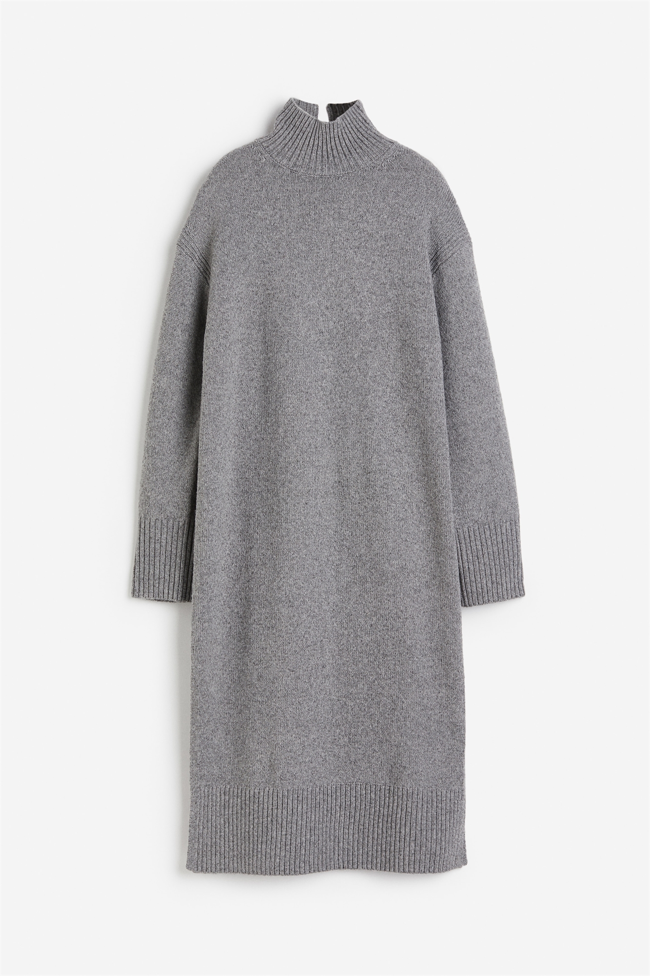 Свободное платье длиной до колен из мягкого трикотажа с добавлением шерсти. Ребристая водолазка с разрезом сзади, спущенные плечи, длинные рукава и прямой подол с разрезом с каждой стороны. Ребра на манжетах и подоле.