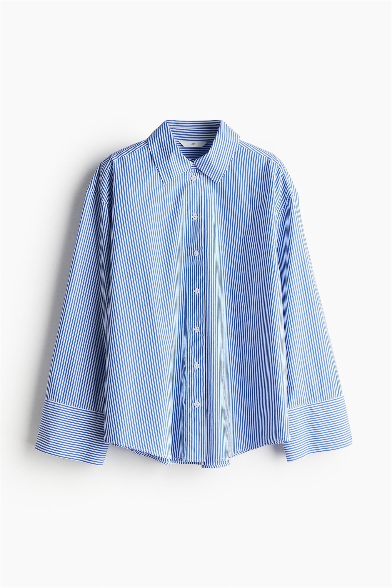 Полосатая рубашка из хлопкового полотна с воротником, пуговицами спереди и ярмом сзади. Свободный крой с опущенными плечами, длинные рукава с манжетами на пуговицах и рукавной планкой с пуговицей. Закругленный подол.