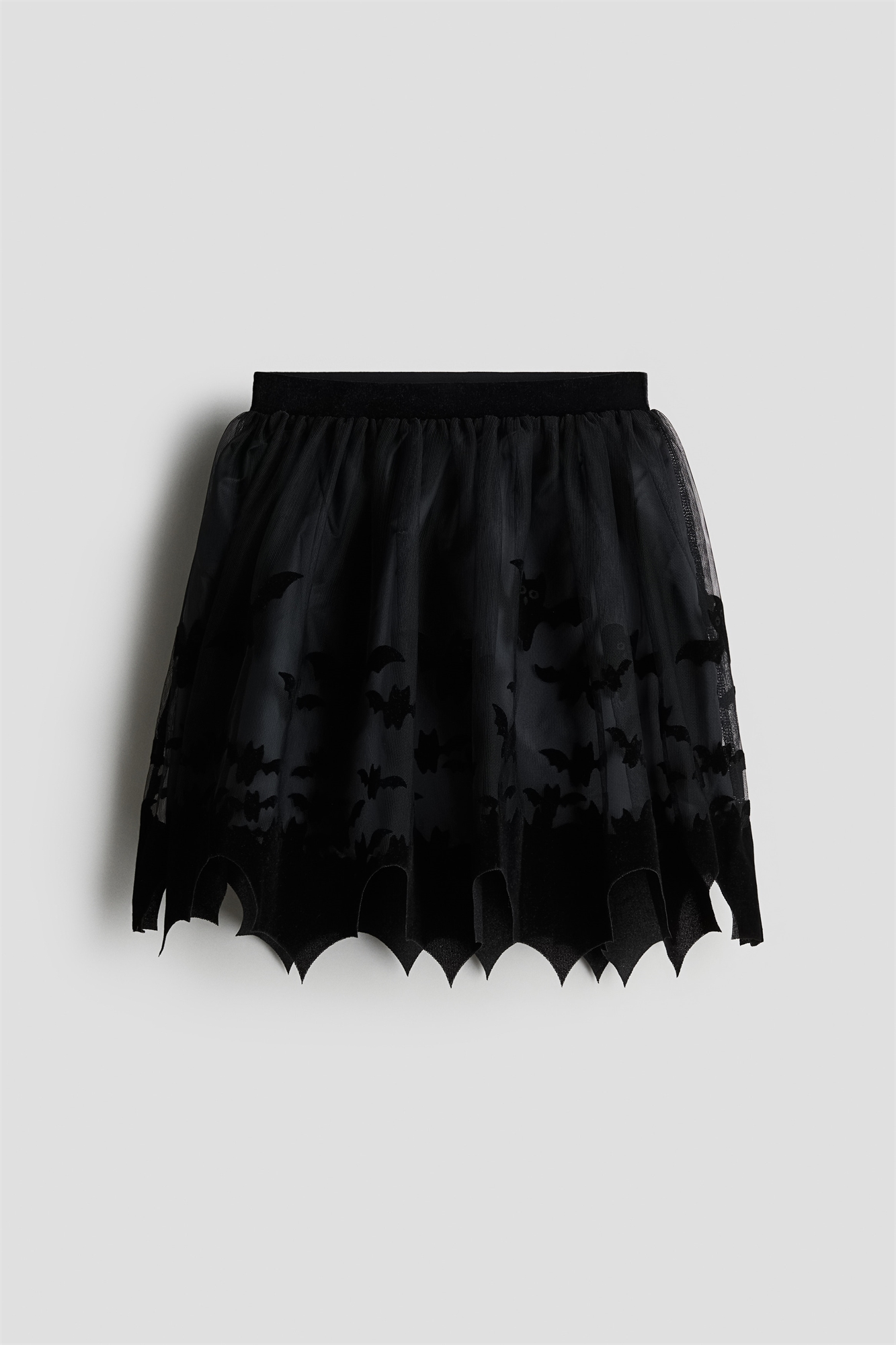 Расклешенная юбка из тюля с флоковым принтом, эластичная талия и неровный подол. На подкладке.