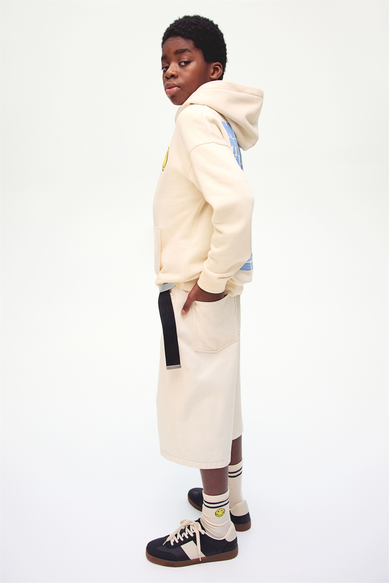 Толстовка свободного кроя из толстовочной ткани с вышитым мотивом спереди и мягким начесом внутри. Капюшон на трикотажной подкладке, отворачивающийся спереди, с опущенными плечами и карманом-кенгуру спереди. Длинные рукава, манжеты и подол отделаны тесемками.