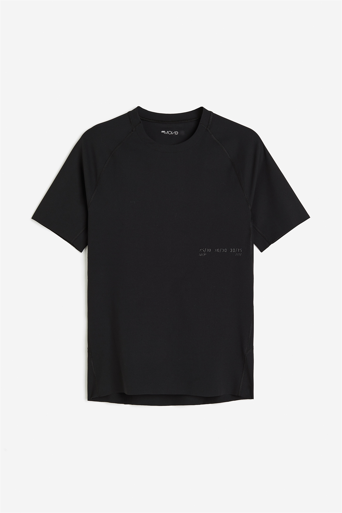 Спортивный топ из функциональной ткани DryMove™, которая помогает отводить влагу от кожи, обеспечивая комфортную сухость во время движения. Короткие рукава реглан, текстовый мотив спереди и прорезанные лазером отверстия сзади для улучшения вентиляции. Манжеты и подол с лазерной окантовкой. Приталенный крой с узкими плечами и зауженными рукавами для создания привлекательного силуэта.
